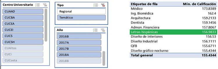 Los jóvenes que ingresan a la licenciatura en Letras hispánicas tienen preferencia por los fenómenos de la lengua y la literatura, además de una inclinación especial hacia las manifestaciones artísticas. Sobra decir que tienen amplias lecturas y, en algunos casos, interés especial por la escritura creativa. Si se revisan los puntajes que obtuvieron los estudiantes en la Prueba de Aptitud Académica (PAA)1 para su ingreso a la Universidad de Guadalajara (UdeG) en los calendarios de 2013A2 a 2018A, los admitidos a la carrera de Letras hispánicas se encuentran en el tercer lugar de puntajes máximos (193.30 puntos) entre las carreras que ofrece el Centro Universitario de Ciencias Sociales y Humanidades (CUCSH), debajo de Derecho y Relaciones Internacionales. Sin embargo, por promedio de puntajes se encuentra en primer lugar (174.54 puntos) de un total general de 159.92. De todas las carreras que ofrece la UdeG, se encuentra en el sexto lugar del puntaje más bajo obtenido (156.98).3 El puntaje más bajo en otras carreras es: Medicina (173.83), Ingeniería biomédica (162.4), Arquitectura (159.21), Odontología (159.14) y Administración financiera (157.80) (véase Tabla 1).4
