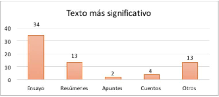 Dentro de la escritura creativa, el cuento es el que obtiene más frecuencias (11). Para los alumnos es significativo porque es una forma de expresión personal que propicia la creatividad y la vinculación con la escritura como un objeto de conocimiento de su entorno. Como parte de la expresión personal, de las ideas propias o de la imaginación, puede ser un punto de liberación. Los textos creativos como los cuentos, responden a una práctica conservada de cuando la enseñanza de la escritura estaba ligada a la enseñanza de la literatura, pero también a la producción de diferentes tipos de textos. La identificación de los textos permitirán evaluar las distintas prácticas letradas. Para los alumnos, el cuento ha sido significativo porque: “desarrolla mi capacidad de escribir” (E22); “Por la libertad de expresarme y encontrar formas creativas de expresar; porque me hizo relacionarme y conocer ese género de escritura” (E10); “Me permite expresarme y comunicarme con el mundo” (E56); “Exploraba mi imaginación, escribía con todo tipo de estructuras” (E40) y para expresarse considerando al lector: “porque me obligaba a que me entendieran usando mi imaginación y la buena redacción” (E62). Esta última respuesta ya demuestra una conciencia pragmática del género. A pesar de que el cuento es una actividad escolar, no está ceñida a estructuras académicas como el ensayo o el resumen. Ello les permite expresar sus inquietudes, pensamientos y practicar su creatividad. Si se repasan las respuestas, la creatividad está ligada con el aprendizaje de la escritura, pero también con su libertad creativa y como una forma de interpretar el mundo.