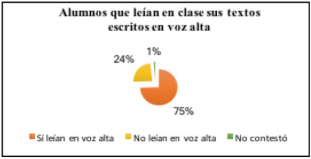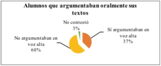 La oralización de los argumentos contenidos en los textos escritos no es frecuente. Según las respuestas de los encuestados, solo 37% lo hacían (véase la Gráfica 4). Sin embargo, ya aparece. Esto puede incorporarse también en la medida que los profesores se sientan capacitados para manejar este tipo de prácticas.