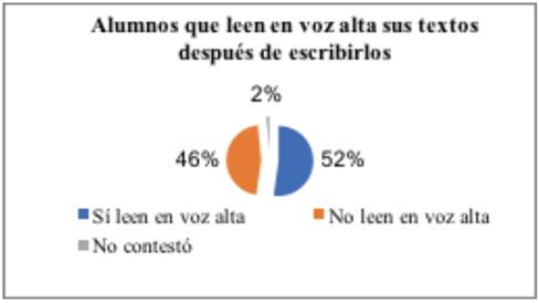 Dentro del proceso de escritura, poco más de la mitad de los encuestados (52%) afirmaron que leían en voz alta sus textos escritos (véase la Gráfica 3). En la Gráfica 2 el porcentaje de lectura en voz alta es más alto, pues se realiza bajo la dirección de un profesor (75%). La lectura en voz alta como una oralización es un proceso personal aunque sea público, es decir, incita a la reflexión individual. La lectura y la escritura son parte de un mismo proceso, por el cual el “trabajo de revisión y corrección textual que se hace con la escritura tiene un correlato con la reformulación y la corrección que el hablante aplica durante su actuación oral” (Mostacero, 2011: 115). En este proceso hay “una reformulación discursiva que el hablante ejecuta a partir de su escucha y de la conciencia sintáctica que como enunciador hace dentro de la construcción de su discurso” (Mostacero, 2011: 116).