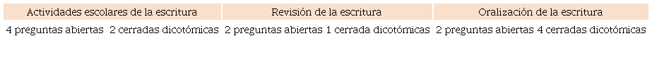 Con estas categorías se diseñó un cuestionario con 15 preguntas de dos tipos: abiertas y cerradas dicotómicas (véase anexo). Las preguntas cerradas nos ayudaron a cuantificar las prácticas educativas recurrentes de niveles anteriores. Las preguntas abiertas permitieron matizar los resultados cuantificados y lograr una explicación más completa de la significación de las prácticas. Las preguntas se distribuyeron como se indica en el cuadro siguiente: