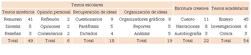 En esta categoría se indagó sobre el texto más solicitado por los profesores durante la vida académica de los estudiantes, desde primaria hasta preparatoria, sobre el trabajo en taller con los textos y lo que fue más significativo para ellos. Conocer el tipo de texto más utilizado permite comprender la perspectiva educativa predominante dentro del proceso educativo; por otra parte, ello ayuda a caracterizar las prácticas letradas que definen las concepciones de la enseñanza de la escritura. Una clasificación útil para la interpretación de los resultados es la que propone Ramírez Silva (2012), quien diferencia los textos académicos de los escolares. Los textos escolares son los que se usan para aprender en las asignaturas, son de uso personal aunque, en ocasiones, los docentes los solicitan para verificar que se está logrando el aprendizaje o como una forma de control para la evaluación. Los textos académicos implican un conjunto de estrategias para la redacción, como la investigación previa, el empleo del lenguaje de la disciplina y la formulación y argumentación de una tesis de escritura. También pueden incluirse los análisis, la opinión personal, la crítica y otras narraciones. El trabajo de los textos en taller como una práctica escolar, permite analizar el trabajo colaborativo. Además de que es una actividad que se ha incorporado dentro de los planes y programas de la educación básica (Secretaría de Educación Pública, 2011).