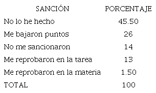 Se solicitó a los encuestados que escogieran el tipo de sanción que solían recibir por parte de los profesores cuando estos se percataban de que la información de la tarea la habían cortado y pegado de internet, presentándola como una idea propia. Vemos sus respuestas en la Tabla 10: