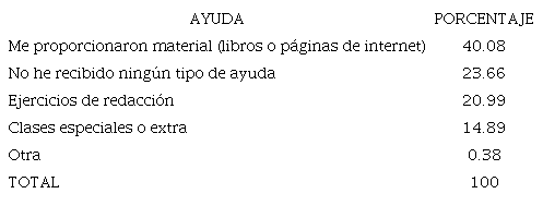 En cuanto a la ayuda que han recibido por parte de los profesores para fortalecer sus habilidades de escritura, los estudiantes mencionaron las que podemos observar en la Tabla 11. Además de las sugeridas, no hubo ninguna otra que ellos citaran.
