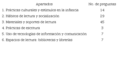 Queremos destacar que de las encuestas aplicadas solo la Encuesta Nacional de Lectura y Escritura 2015-2016 (CONACULTA, s/f.) menciona explícitamente el tema de la escritura, aunque únicamente se hicieron tres preguntas al respecto (¿qué tanto diría que le gusta escribir?, ¿usted escribe? y ¿por qué razón escribe usted?). En la Tabla 1 se pueden apreciar los apartados de los que consta dicha encuesta, así como el número de preguntas en cada uno de ellos.