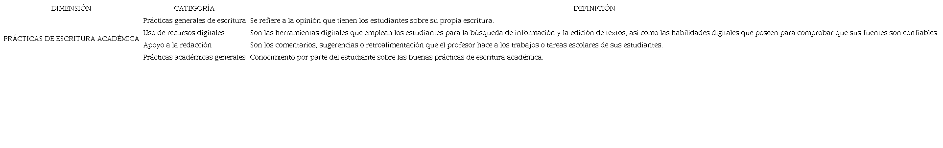 Dicho instrumento tuvo como objetivo explorar los aspectos relacionados con las prácticas de escritura académica de los estudiantes, constaba de 20 preguntas, 11 eran de opción múltiple y nueve abiertas. Estaban divididas en cuatro categorías, descritas en la Tabla 2.