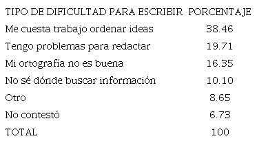 Se cuestionó a los estudiantes si consideraban que tenían dificultades para escribir textos académicos; 36.06% dijo que sí, mientras 62.98% reportó no tenerlos, y solo 0.96% no respondió a esta pregunta. Sin embargo, cuando más adelante se les pregunta sobre las principales dificultades que enfrentan para escribir, más de 93% reporta tener alguna. Las respuestas se distribuyeron como se muestra en la Tabla 3: