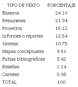 También se les pidió a los estudiantes que indicaran cuáles eran los textos académicos que más solicitan los profesores para evaluarlos (véase la Tabla 4).