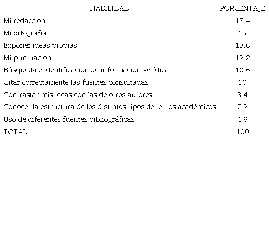 En relación con las habilidades de escritura que creen deberían fortalecer (véase la Tabla 5), destacan la redacción, la ortografía y exponer ideas propias.