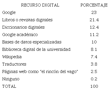 En la Tabla 6 se muestran los recursos digitales que más se utilizan. Resaltan Google, los libros y las revistas digitales y los diccionarios. Con porcentajes más bajos se encuentran los traductores y las páginas web de repositorios de textos.