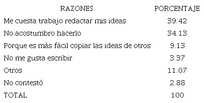 La respuesta que destacó en este ítem fue que les cuesta trabajo redactar sus ideas, es decir, probablemente esto esté relacionado con que no logren distinguir o construir su propia opinión, su propia voz, desligándola del discurso del autor que estén revisando. Esta serie de dificultades los lleva a preferir copiar ideas de otros, que fue la segunda opción con mayor porcentaje.