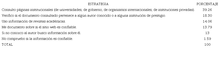 En la Tabla 8 vemos las estrategias que utilizan estos estudiantes para comprobar que la información que encuentran en internet para hacer sus tareas o trabajos escolares es confiable: