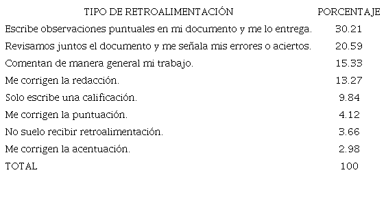En estas cifras advertimos que más de 50% de los encuestados reciben una retroalimentación considerada por parte de sus profesores; alrededor de 35% reciben comentarios y correcciones puntuales; cabe destacar que una porción que apenas rebasa 13% fue la que declaró que les conceden alguna ayuda para mejorar sus escritos.
