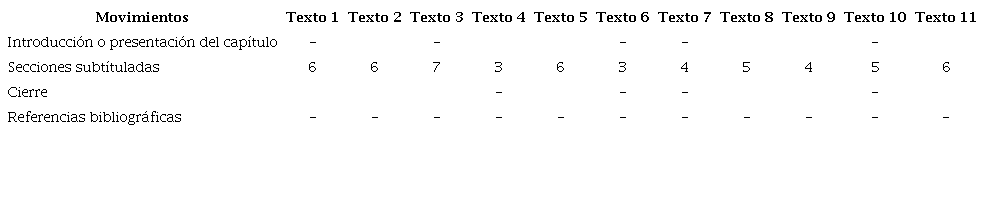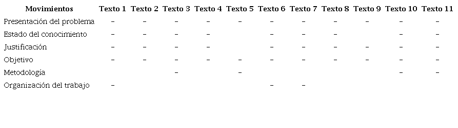 Así, la estructura retórica de la introducción y del marco teórico halladas en nuestra muestra presentan un patrón homogéneo; hecho que muy probablemente se debe a la orientación metodológica recibida por los estudiantes en el Seminario de Investigación I, en el que trabajaron estas dos secciones de la tesis, y en el que se aplicaron los acuerdos establecidos por el consejo académico del posgrado en cuanto a las características que la tesis debe presentar en esta maestría en particular. En lo que respecta a la Introducción, en los 11 casos revisados, esta precede al capítulo teórico en el que se hace la revisión de la literatura y se establece el marco conceptual que guía el análisis y reflexión sobre la problemática abordada. La introducción presenta un patrón conformado por seis movimientos: 1) presentación del problema; 2) breve estado del conocimiento; 3) justificación; 4) objetivo; 5) metodología y 6) organización del trabajo. En la Tabla 1 presentamos lo hallado al analizar la muestra. Para facilitar el análisis, hemos identificado a cada avance de tesis con la etiqueta “texto” agregando un dígito identificador. La presencia del movimiento está señalada con el signo (-).
