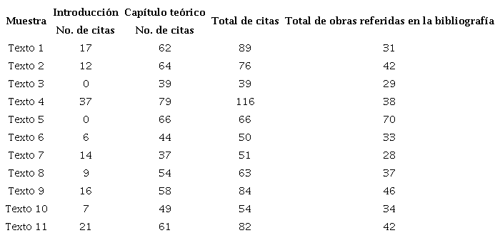 La muestra está conformada por borradores de la introducción y un capítulo teórico de 11 tesis en proceso de producción, en una maestría en el área de humanidades de una universidad pública mexicana. Si bien se trata de una pequeña muestra que, por lo mismo, no nos permite llegar a resultados concluyentes, su análisis nos da pauta para futuros estudios que nos ayuden a profundizar en la investigación sobre la construcción de autoría, la atribución del conocimiento y el plagio textual en la formación de jóvenes investigadores.