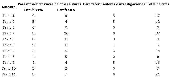 En resumen, esta primera exploración de los mecanismos de cita presentes en la muestra, revela que la elección del tipo, la función y el número de citas dependen de los propósitos retóricos de cada escritor, pero también puede deberse a las experiencias previas de escritura que los autores han tenido a lo largo de su formación. Un estudio sobre las concepciones que los jóvenes escritores tienen con respecto a estos recursos puede ayudarnos a aclarar muchas de las interrogantes que surgen al observar los mecanismos de atribución de conocimiento propio y ajeno en la escritura inexperta.