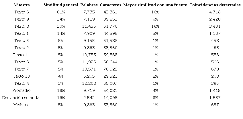 En este trabajo, no es de nuestro interés discutir el tema de los porcentajes de coincidencia para señalar a presuntos plagiarios, sino describir y explicar la presencia de similitudes entre los textos analizados y las fuentes referidas. Por lo mismo, nos centramos en el rastreo de coincidencias sin hacer evaluaciones de orden ético. Bajo este supuesto, en el proceso de identificación tomamos en cuenta todas las bases de datos del programa; y para centrar la atención en las secciones de textos que los estudiantes presentan como propias u originales, se excluyeron del resumen de coincidencias la bibliografía, las citas textuales, el parafraseo con referencia y las coincidencias menores a diez palabras que pueden ser considerados una copia legítima, como lo explicamos en nuestro marco referencial. En todos los textos que conforman la muestra se observan coincidencias en diferentes grados (véase la Tabla 6).