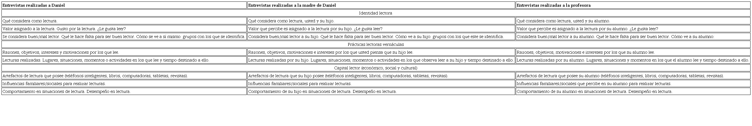 La entrevista es una técnica confiable que permite producir datos de manera sistemática, ya que se trata de un encuentro interactivo en el que el conocimiento se construye alrededor de preguntas y respuestas, otorga la posibilidad de comprender, más que explicar, los diferentes significados que las personas atribuyen a las diversas situaciones de su vida (Fontana, Frey, 2000). En este trabajo se realizaron entrevistas semiestructuradas, pues estas permiten comprender la perspectiva del entrevistado sobre sus propias experiencias y vivencias personales en relación con el tema particular de la lectura, a partir del seguimiento, no de preguntas previamente elaboradas sino de una lista general de aspectos por cubrir (Taylor, Bogdan,1987). Esta lista se configuró como un guion de las entrevistas, que se muestra en la Tabla 1. En ella se detallan los temas que se abordaron durante las entrevistas realizadas a Daniel, a su madre y a su profesora.