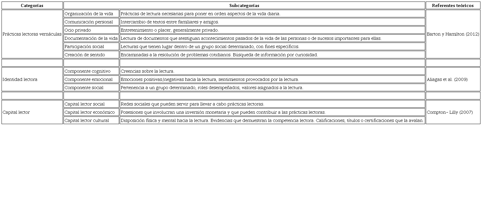 Segunda etapa: Se establecieron subcategorías de análisis a partir de cada una de las categorías previamente identificadas, de acuerdo con los conceptos provenientes de los referentes teóricos (Aliagas et al., 2009; Barton, Hamilton, 2012; Compton-Lilly, 2007). Mediante las categorías y subcategorías establecidas se organizaron y clasificaron los datos brutos (diario de campo, entrevistas y autorregistros) para vincular la realidad observada con la teoría. Las categorías con sus subcategorías correspondientes, así como el referente teórico de donde procede, pueden observarse en la Tabla 2.
