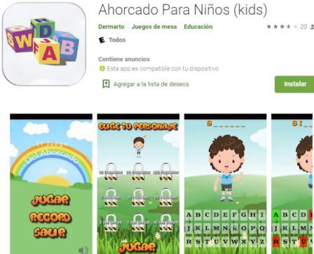 En lo relativo al juego del ahorcado, la aplicación lo describe como un juego de adivinanzas que favorece el aprendizaje de la ortografía: