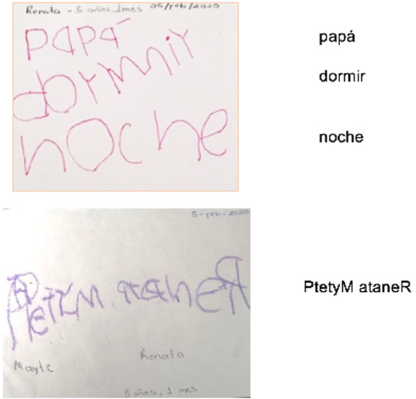 En relación con la escritura de palabras, los estudiantes pusieron en juego sus conocimientos sobre la lengua escrita. En lasFiguras 5 y 6se muestra la escritura de la alumna Renata Mayte, quien, en el caso del cuento Macaquiño, escribe las palabras de manera convencional, con una direccionalidad de izquierda a derecha, tomando en cuenta las características cuantitativas, incluso el acento ortográfico. Sin embargo, al escribir su nombre lo hace de manera inversa, con algunas omisiones de grafías y una direccionalidad de derecha a izquierda, lo que indica que está en este proceso de apropiación del sistema de escritura.