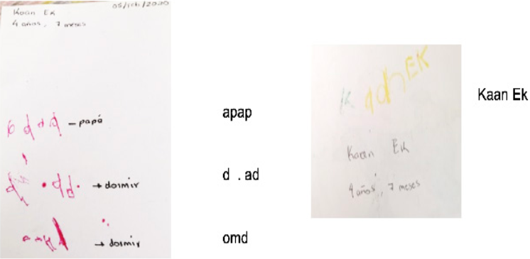 Otro ejemplo que se retoma en las Figuras 7 y 8 alude al alumno Kaan Ek, quien se caracteriza por escribir la palabra papá de manera convencional, solo que lo hace de derecha a izquierda. En el caso de las dos últimas palabras, se acerca a escrituras silábicas (aunque otra vez escribe de derecha a izquierda). Por el contrario, su nombre lo escribe de manera convencional, lo que habla de la importancia de esta palabra para él.