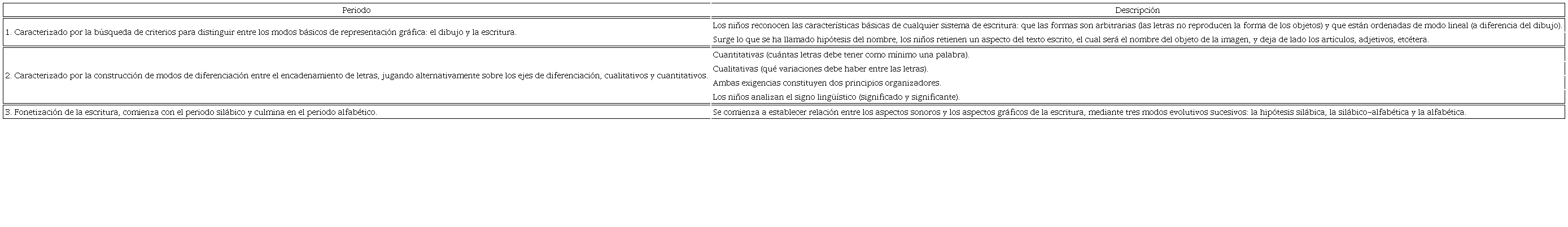 Es frecuente que los niños preescolares se ubiquen en el primero y segundo periodo de alfabetización inicial. En particular, en lo que compete al segundo periodo (también llamando presilábico), estudios como el de Cázares (2010)), con base en Ferreiro (2006), hacen una subdivisión del mismo en A, B y C, solo para fines de reconocimiento del avance de un grupo de alumnos que participaron en un diseño didáctico.