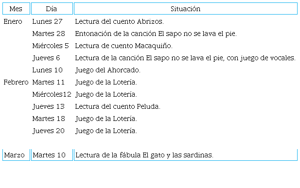 Al término de la lectura se preguntaba a los alumnos si notaron lo que sucedía con las letras en la pantalla, así como sus impresiones de la historia. Si los estudiantes mostraban interés en el contenido, se les volvía a leer. También se les invitaba a localizar algunas palabras presentes en los textos; finalmente, se les invitaba a escribir estas palabras en hojas blancas. En el caso de la canción, se siguió la misma ruta de acciones que para los cuentos y fábulas, con la diferencia de que se entonaban las frases.