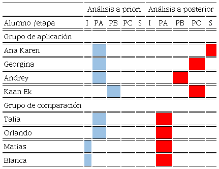 En la Tabla 3 se presenta un comparativo de los resultados obtenidos en el análisis previo (en azul) y el posterior (en rojo), respecto a las conceptualizaciones de la lengua escrita de la muestra de alumnos de ambos grupos. En lo que corresponde al grupo de comparación, dos alumnos pasaron del nivel icónico al presilábico A; sin embargo, dos permanecen en el mismo subnivel. En el caso del grupo de aplicación se observó que todos los niños alcanzaron nuevos subniveles del presilábico, incluso, un niño avanzó al tercer periodo (silábico). Estos alumnos lograron escribir su nombre de manera convencional, identificando las vocales que lo componen; en algunos casos escribieron una grafía para representar una sílaba, y emplearon grafías diferentes a las que conforman su nombre.