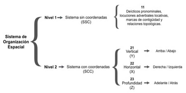 El sistema de organización espacial sin coordenadas establece la referencia de forma altamente contextualizada, por lo que emplea deícticos pronominales del tipo aquí, allá, al lado de, locuciones adverbiales locativas, marcas de contigüidad y relaciones topológicas (en la mesa, en la silla), así como nombres de lugares (por ejemplo, Querétaro). Por su parte, el sistema de referencia con coordenadas de tipo cartesiano toma como referente los ejes imaginarios cartesianos, que no son otra cosa que abstracciones del espacio; los deícticos de los que se vale este tipo de sistema son: en el plano vertical (eje Y) arriba-abajo, en el plano horizontal (eje X) derecha-izquierda y la profundidad (eje Z) adelante-atrás.