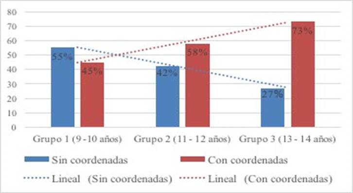 La figura muestra que los participantes más pequeños tienden a emplear el sistema de referencia sin coordenadas, siguiendo este una clara línea evolutiva descendente. A la inversa, los participantes mayores emplean con mayor asiduidad el sistema de organización con coordenadas y también se observa una línea evolutiva, aunque en este caso ascendente (de los participantes más pequeños a los más grandes). Sin embargo, resulta interesante constatar que, si bien los participantes se apoyan más en uno u otro sistema, todos los grupos emplean ambos modos de organización espacial, lo que significa que este tipo de expresiones lingüísticas se mantienen a lo largo de la vida.