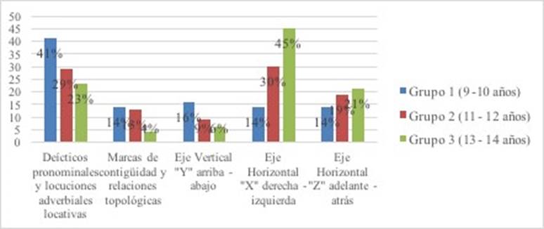 El primer aspecto a destacar de la figura anterior, si se centra la atención sobre las barras relativas al sistema sin coordenadas, es que tanto los deícticos pronominales/locuciones adverbiales locativas y las marcas de contigüidad y relaciones topológicas presentan una curva evolutiva descendente, sin embargo, es evidente que, como estrategia para describir la ubicación espacial, los deícticos pronominales y las locuciones adverbiales locativas son mucho más importantes para los participantes que las marcas de contigüidad y relaciones topológicas.