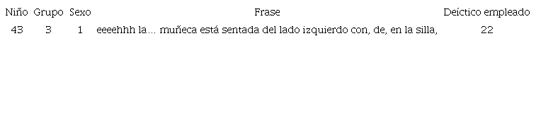 En la tabla anterior se muestran cinco columnas. La primera se refiere a la codificación que se le dio a cada participante (del 1 al 60); la segunda consigna el grupo etario al que pertenece (Grupo 1: niños pequeños; Grupo 2: medianos; Grupo 3: grandes); la columna 3 se refiere al sexo de los participantes: 1 para las niñas y 2 para los niños. La cuarta columna es el texto oral que produjo el niño, y en la quinta columna se consigna la categorización global de la respuesta del niño, en función del tipo de deíctico empleado para dar la ubicación espacial del objeto.