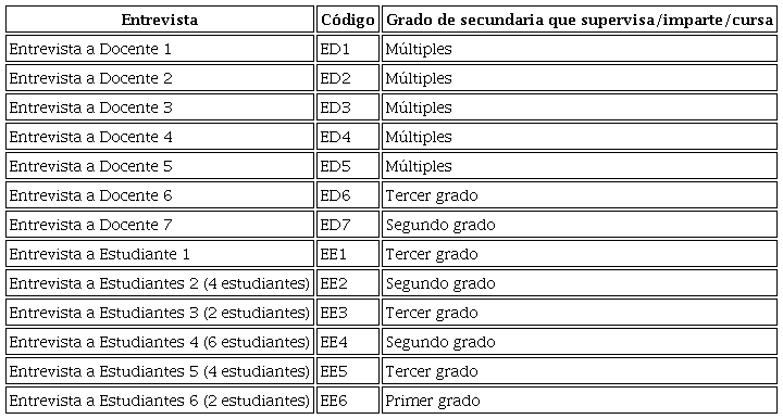 Tomando en cuenta estos dos antecedentes, se consideró que la temática de la violencia estudiantil es sensible y algunas veces personal, por lo que se optó por un muestreo intencional. Los participantes fueron siete docentes y 19 alumnos(as) de los tres grados de secundaria (véase Tabla 1). Las entrevistas con el personal docente se realizaron de manera individual, mientras las entrevistas a estudiantes se hiceron en grupos (Simons, 2011).