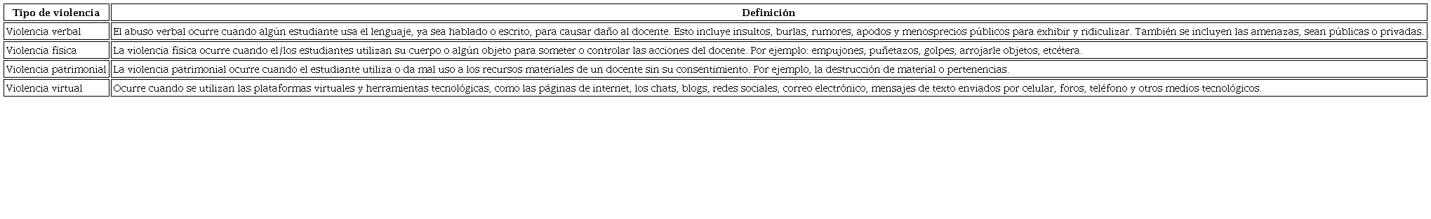 Moon y McCluskey (2018) analizaron la formas de violencia sufridas por docentes durante el año previo al estudio, e indentificaron cinco tipos de acciones violentas: daño a la propiedad, violencia física, verbal, acoso sexual y agresión sin contacto. Las formas de violencia leve se reportaron con mayor frecuencia que las graves; el abuso verbal y la agresión sin contacto fueron las más señaladas. A pesar de que la violencia física y el acoso sexual fueron las menos frecuentes, aproximadamente uno de cada diez docentes lo reportaron.