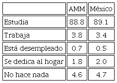 Por tipo de actividad, se observa que 88.8% de los adolescentes en el AMM estudiaba, mientras en la media nacional esta proporción se ubicaba en 89.1%; de los adolescentes del AMM 3.8% trabajaba y, por su parte, en la media nacional esta proporción era 3.4%; el desempleo en el AMM era 0.7%, mientras que en la media nacional era 0.5%; 2% de los adolescentes de México y 1.8% de los del AMM se dedicaban al hogar; finalmente, el porcentaje de adolescentes que declaraban no hacer nada, es decir, que podrían ser clasificados como “Ninis”, era 4.6% en el AMM y 4.7% en la media nacional en 2014 (Tabla 1).