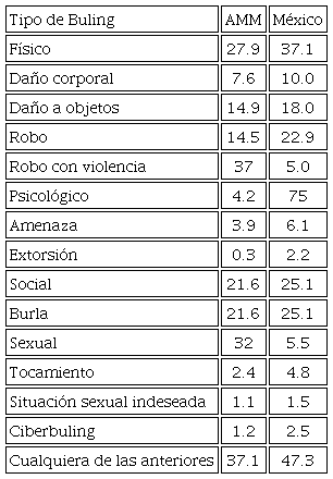 Por otra parte, los estudios de ciberbuling en México son muy escasos, entre ellos se encuentran el de Del Río et al. (2009), quienes estudiaron el acoso digital en escolares de 10 a 18 años en varios países de Latinoamérica, y entre sus resultados mencionan que en México 14.7% de los estudiantes en este rango de edad son víctimas de ciberacoso; el de Lucio (2009), quien hizo un estudio entre jóvenes de preparatoria de la UANL para evaluar la prevalencia del ciberbuling entre estudiantes de esta universidad, y encontró que 20% de estos jóvenes eran ciberagresores y que las agresiones incluían insultos, amenazas, acoso sexual, chantajes, mensajes desagradables, comentarios difamatorios, rumores con el objetivo de desprestigiar, envío de videos desagradables, fotografías subidas para desprestigiar o ridiculizar, robo de contraseñas y hackeo de cuentas; por su parte, García-Maldonado et al. (2012) realizaron un estudio entre adolescentes de 11 a 15 años (estudiantes de una secundaria en Tampico, Tamaulipas) con el objetivo de determinar la prevalencia del ciberbuling, y encontraron que 3.5% de estos jóvenes eran víctimas, 2.8% eran agresores y 1.3% tenían el doble rol de víctimas/agresores; mientras que Vega-López et al. (2013), llevaron a cabo un estudio entre jóvenes de 12 a 15 años de secundarias públicas en Tlaquepaque, Jalisco, para identificar la prevalencia de víctimas de ciberacoso y las características de la agresión que llevaban a cabo, y encontraron que 14.3% de estos jóvenes eran víctimas de ciberbuling y que las principales formas de agresión eran la trasmisión de textos e imágenes insultantes y los mensajes de texto e imágenes negativas; además, encontraron una mayor prevalencia entre el sexo masculino.