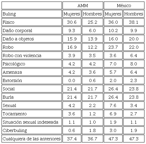 En México en 2014, 47.3% de los adolescentes declararon haber sufrido alguna situación que puede ser clasificada como buling o ciberbuling, por lo menos una vez durante el último año, mientras que en el AMM esta cifra se ubicó en 37.1%, esto es, 10 puntos porcentuales por debajo de la media nacional (Tabla 2).