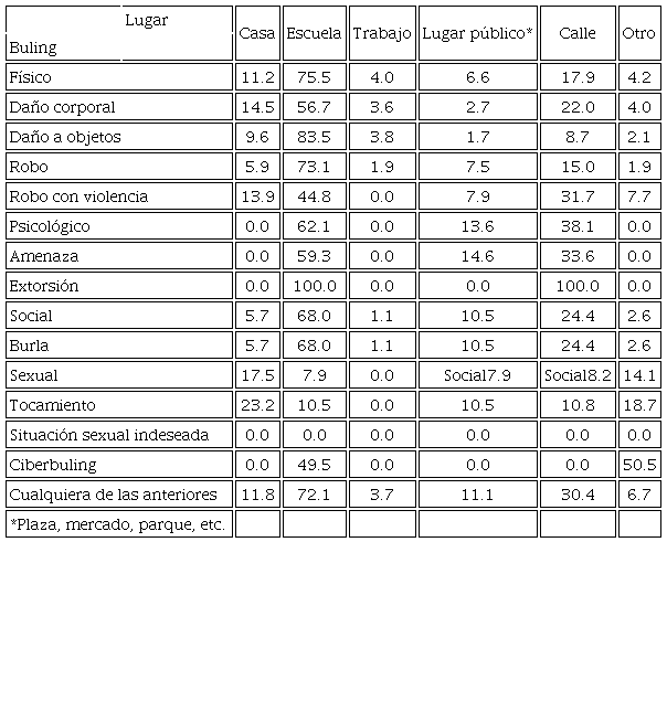 El buling de tipo social, es decir, las burlas, apodos, exclusión, etc., se presentó principalmente en la escuela (68%), la calle (24.4%) y los lugares públicos (10.5%). Por otra parte, los adolescentes del AMM mencionaron que fueron víctimas de ciberbuling en la escuela (49.5%) y en otro lugar (50.5%).