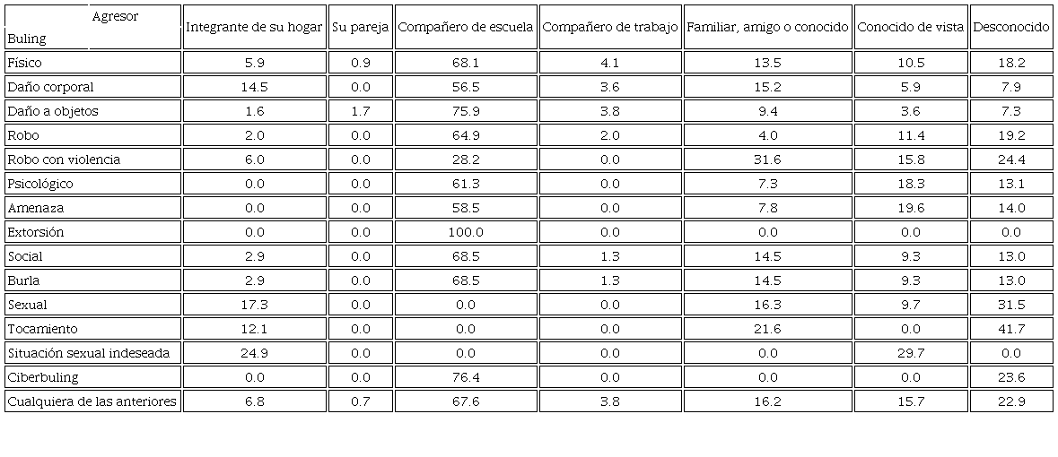 En cuanto al buling de tipo físico, se observa que 68.1% de los adolescentes del AMM mencionaron que su agresor es un compañero de su escuela; 18.2% de los casos mencionó a un desconocido y 13.5% señaló a un familiar, amigo o conocido. Específicamente por tipo de situación, 56.5% de los adolescentes mencionaron que el agresor que les causó daño físico era compañero de la escuela; 15.2%, que era un familiar, amigo o conocido y 14.5%, que era un integrante de su hogar. Respecto a la situación donde se hace daño o se le esconden sus objetos, 75.9% de los adolescentes mencionó que el agresor era un compañero de la escuela; 9.4% a un familiar, amigo o desconocido; y 7.3% a un desconocido. 64.9% de los adolescentes que son víctimas de robo, mencionaron que el agresor fue un compañero de escuela; 19.2% que fue un desconocido y 11.4% a un conocido de vista. En cuanto a la situación de robo con violencia, 31.6% de los adolescentes mencionó haber sido víctima de esta situación por parte de un familiar, amigo o conocido; 28.2% mencionó a un compañero de la escuela; 24.4% a un desconocido; y 15.8% a un conocido de vista.
