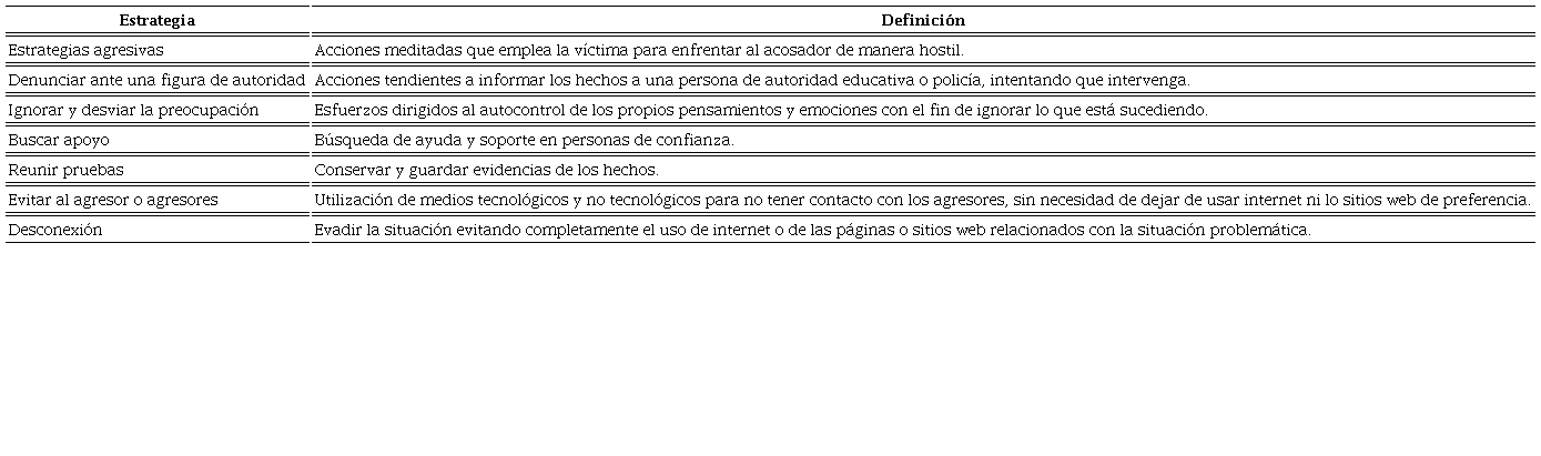 Inventario de Estrategias de Afrontamiento del Ciberbullying desde la perspectiva de la Víctima (IEAC-V). Es un instrumento que se diseñó para valorar el grado en que los adolescentes tienden a emplear siete tipos de estrategias para hacer frente a posibles situaciones de ciberacoso en caso de llegar a ser víctimas: 1) Estrategias agresivas, con seis reactivos que miden las acciones meditadas empleadas por la víctima para enfrentar al acosador de manera hostil, por ejemplo: postear cosas negativas del agresor y de sus cómplices y amenazar a quienes me están acosando; 2) Denunciar, con cinco reactivos que evalúan las acciones tendientes a informar los hechos a una persona de autoridad intentando que intervenga, por ejemplo: contárselo a un profesor y contárselo al prefecto de disciplina; 3) Ignorar y desviar la preocupación, con seis reactivos que estiman los esfuerzos dirigidos al autocontrol de los propios pensamientos y emociones con el fin de ignorar lo que está sucediendo, por ejemplo: intentar no pensar en lo que está pasando y tomarlo con humor y pensar que no es tan grave; 4) Buscar apoyo, con cuatro reactivos que valoran la búsqueda de ayuda y soporte en personas de confianza, por ejemplo: contárselo a algún familiar y pedir ayuda a una persona de confianza y juntos pensar qué hacer al respecto; 5) Reunir pruebas, con tres reactivos que miden la conservación, y guardar evidencias de los hechos, por ejemplo: hacer captura de pantalla para guardarla como prueba; 6) Evitar al agresor, con cuatro reactivos que valoran la utilización de medios tecnológicos y no tecnológicos para no tener contacto con los agresores, sin necesidad de dejar de usar internet ni lo sitios web de preferencia, por ejemplo: evitar tener cualquier tipo de contacto con los agresores y bloquear al acosador en la cuenta (Facebook, Twitter, Instagram, etc.); y 7) Desconexión, con tres reactivos que miden el evadir la situación evitando completamente el uso de internet o de las páginas o sitios web relacionados con la situación problemática, por ejemplo: dejar de utilizar internet.
