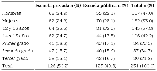 La muestra del presente estudio estuvo constituida por 251 adolescentes con rango de edad de 12 a 15 años (M = 13.27, DE = 0.96), los cuales pertenecían a dos planteles escolares de nivel secundaria ubicados dentro de la Zona Metropolitana de Guadalajara, Jalisco, uno de sostenimiento privado y otro público. En la Tabla 2 se presenta la distribución de los participantes por género, edad y grado escolar de cada una de las dos escuelas participantes.