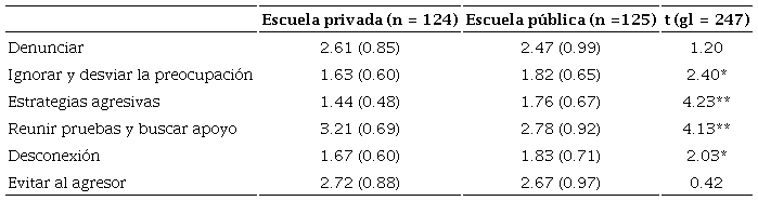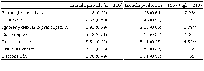 Pasando al objetivo principal del presente estudio, como se pudo observar, la escuela pública presentó puntuaciones más elevadas en las estrategias agresivas, y en ignorar y desviar la preocupación; mientras que la escuela privada mostró puntuaciones más altas en buscar apoyo, reunir pruebas y evitar al agresor. Las estrategias de afrontamiento son diferentes en las escuelas públicas y privadas. En la escuela pública las estrategias son más agresivas y pueden provocar la no solución del conflicto sino su escalada a niveles más agresivos, así como el ignorar y desviar la preocupación pueden propiciar la revictimización. En el caso de la escuela privada, que favorece más buscar apoyo, reunir pruebas y evitar al agresor, propicia la denuncia, evita la confrontación y permite la intervención de otros elementos para la resolución pacífica de conflictos, evitando con ello la escalada a niveles más agresivos y la revictimización.