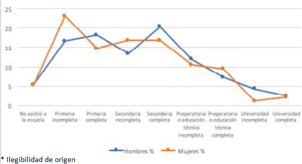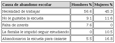 Para la década de 2010, una encuesta realizada por el CIDE (2012) mostró datos interesantes sobre el perfil de quienes se encuentran sentenciados por la comisión de delitos. Algunas cifras que cabe destacar relacionan pobreza, delincuencia y educación; por citar un ejemplo, se observa que el nivel educativo de quienes se encuentran presos está por debajo de la media nacional de escolaridad y más de 80% tienen estudios inferiores a secundaria (Gráfico 1). Además, se menciona que la necesidad de trabajar es la causa principal para abandonar la escuela, lo que se asocia directamente con la pobreza; otro dato sugerente es que 10.5% de las mujeres declaran que dejaron de estudiar por presión de la familia, situación que no experimentó ningún hombre, así como también es significativamente mayor el número de mujeres que dejó de estudiar para casarse (véase Tabla 3).