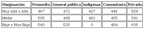 Los cruces de variables demuestran la tendencia persistente de que la precariedad en aspectos económicos está asociada con el bajo desempeño académico; por ejemplo, en el caso de las comunidades indígenas, no existe ninguna escuela ubicada en zonas de baja marginación, y los resultados más altos se encuentran muy por debajo de los obtenidos en las escuelas de capital privado (véase Tabla 2). Esto pareciera confirmar que, a poblaciones pobres, educación pobre.