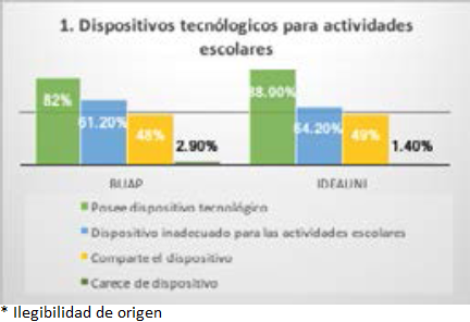 Finalmente, para las fechas de aplicación del instrumento (noviembre 2020 y enero 2021 respectivamente), 1.4% del total de la muestra afirmó no contar con dispositivos que les permitieran tomar las clases (véase Gráfico 1).