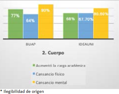 Al respecto, 64% de los estudiantes de la BUAP considera que durante las clases en línea ha padecido cansancio físico y 90% cansancio mental. En comparativa entre las clases en línea y las clases presenciales, 63.3% de los estudiantes expresaron controlar mejor su cansancio físico y mental en el espacio escolar que en el de su casa. Mientras que en el IDEAUNI se observó que: 67.7% perciben cansancio físico y 80.6% cansancio mental; 54.2% de los estudiantes expresaron controlar mejor su cansancio físico y mental en el espacio escolar que en el de su casa.