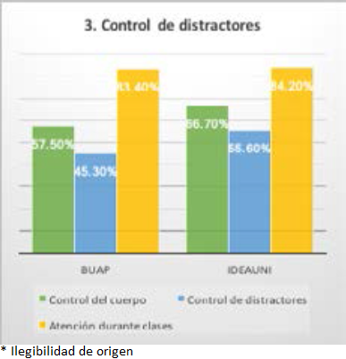 En la misma línea, se les preguntó si “la institución escolar tiene control sobre los distractores que pueden afectar mi aprendizaje”. Los estudiantes de la BUAP respondieron estar de acuerdo con 45.3%, 28.1% fue neutral y 26.7% en desacuerdo. En el caso del IDEAUNI, el 55.6% estuvo de acuerdo, 23.6% fue neutral y 20.9% estuvo en desacuerdo.