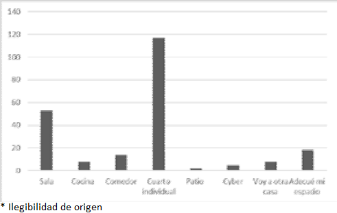 De acuerdo con Contreras (2019), existen brechas en torno a la creación de un espacio ideal de aprendizaje virtual en el hogar, y al no contar con el espacio propio y adecuado para recibir las clases, la falta de equipos de cómputo o dispositivos móviles para las conexiones virtuales, o la falta de mobiliario adecuado para el desempeño en los espacios virtuales de aprendizaje en línea, se limitan el aprovechamiento y rendimiento académico escolar. De igual manera, García (2020) menciona que es imperativo contar con espacios adecuados con pocos distractores dentro del hogar. Con esto se pone de manifiesto que los estudiantes de la Escuela de Enfermería no cuentan con espacios adecuados y diseñados para poder recibir de manera óptima sus clases sincrónicas por medio de las salas de videoconferencias, al tener que recibirlas desde su cuarto individual, el patio, en el comedor o cocina y algunos en casa de otro familiar o en un ciber, y sólo muy pocos han logrado adecuar un espacio exclusivamente para sus clases.