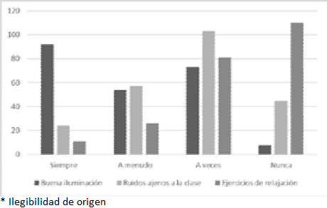 Con los resultados obtenidos en el apartado del entorno virtual de aprendizaje se concluye que 92 alumnos cuentan con una buena iluminación en su área de estudio, 54 mencionan que a menudo, 73 a veces y 8 refieren no contar con iluminación suficiente y adecuada. Este factor de la iluminación interviene de manera directa en el estado de concentración y prevención de daños oculares. En el caso de los ruidos ajenos a la clase, 201 alumnos mencionan tener algún tipo de ruido de fondo al estar en áreas comunes del hogar en donde la familia, amigos, vecinos, dispositivos electrónicos, ruidos exteriores al hogar, intefieren en la escucha activa durante las sesiones virtuales; solamente 24 alumnos mencionaron que cuentan con espacios libres de ruidos que pudieran alterar su percepción y concentración en cada una de sus clases (Figura 4).